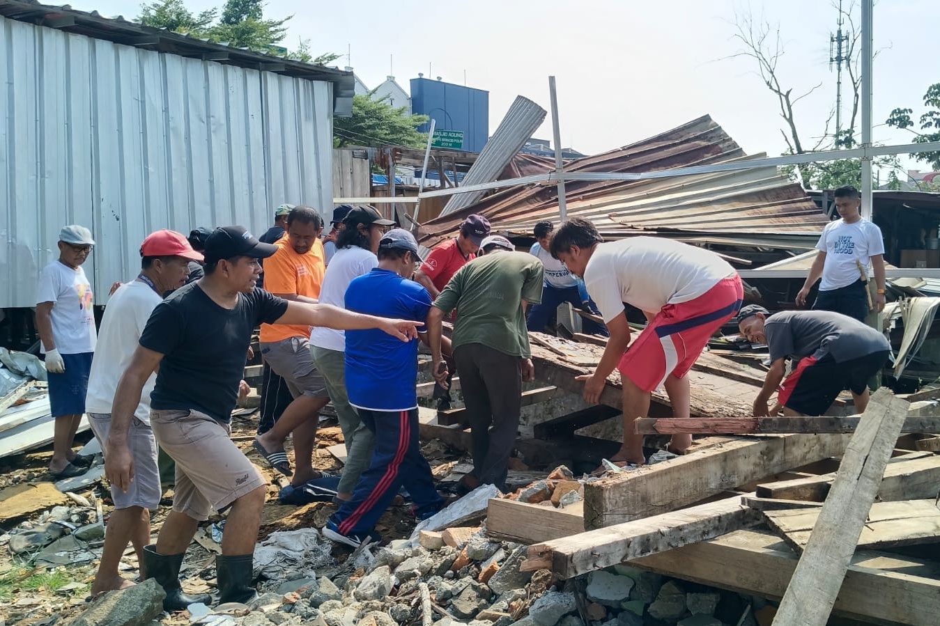 Material sisa bongkaran tersebut menutup jalur air dan menghambat aliran, sehingga air meluap ke permukiman warga.