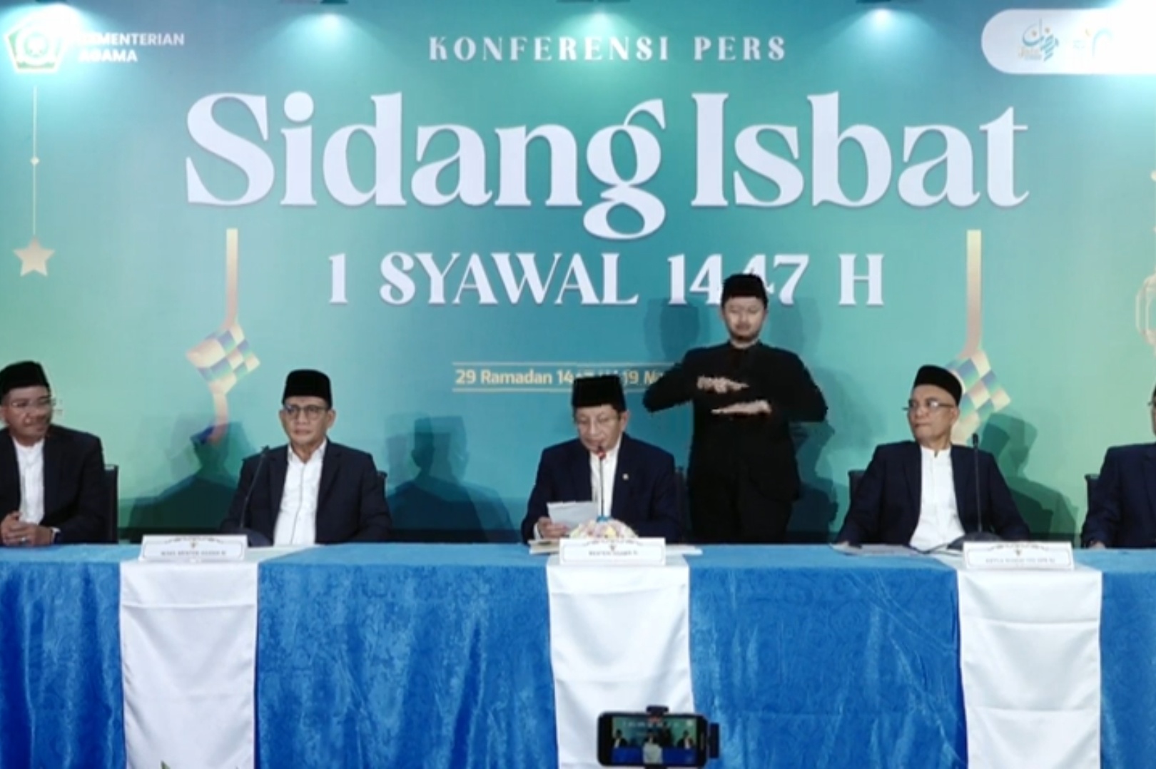 “Berdasarkan hasil hisab serta tidak adanya laporan hilal terlihat, disepakati bahwa 1 Syawal 1447 Hijriah jatuh pada hari Sabtu, 21 Maret 2026,” pungkas Nasaruddin.