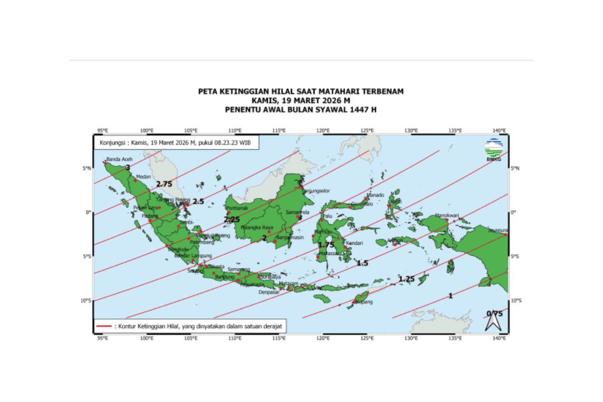 BMKG memprediksi bahwa ketinggian hilal pada saat Matahari terbenam tanggal 19 Maret 2026 di wilayah Indonesia bervariasi.
