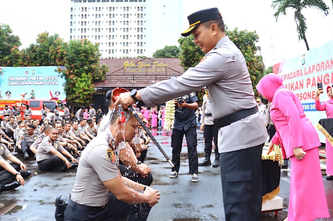 Prosesi kenaikan pangkat ditandai dengan tradisi siraman air kembang yang telah menjadi budaya turun-temurun di lingkungan Polri.