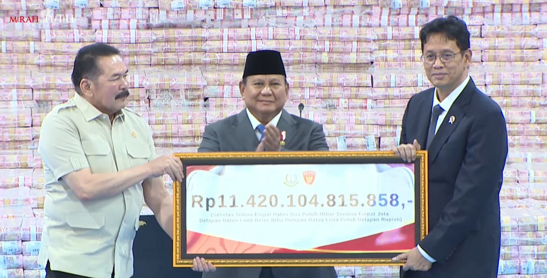Jaksa Agung Sanitiar Burhanuddin menegaskan bahwa total dana yang diserahkan mencapai Rp 11.420.104.815.858 yang seluruhnya telah masuk ke kas negara.