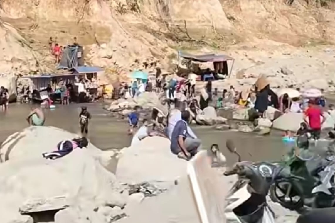 Sementara itu, sebagian warga lainnya memilih duduk santai di atas bebatuan besar yang berada di tengah sungai, menikmati suasana alam terbuka yang kini kembali bisa diakses.
