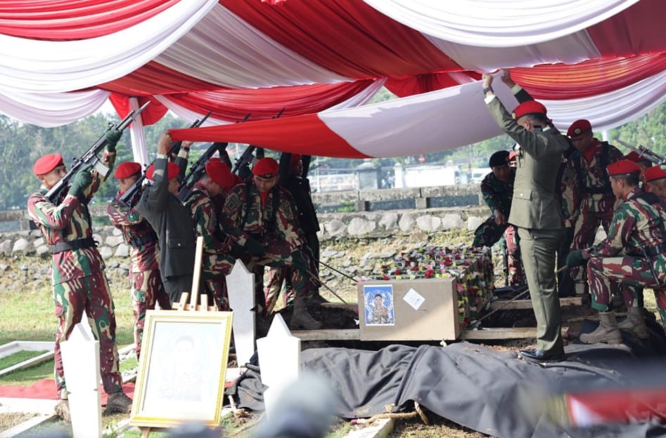 Suasana haru menyelimuti lokasi saat jenazah perlahan diturunkan ke liang lahat, diiringi tembakan salvo sebagai bentuk penghormatan terakhir bagi prajurit korps baret merah tersebut.
